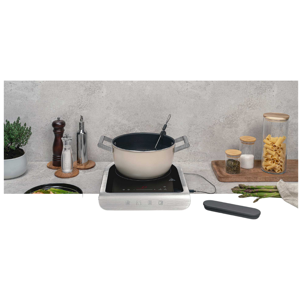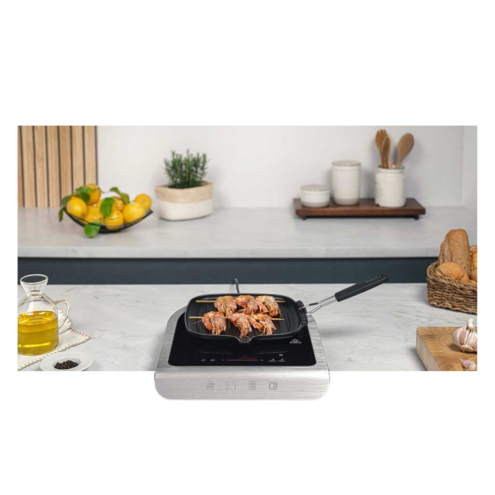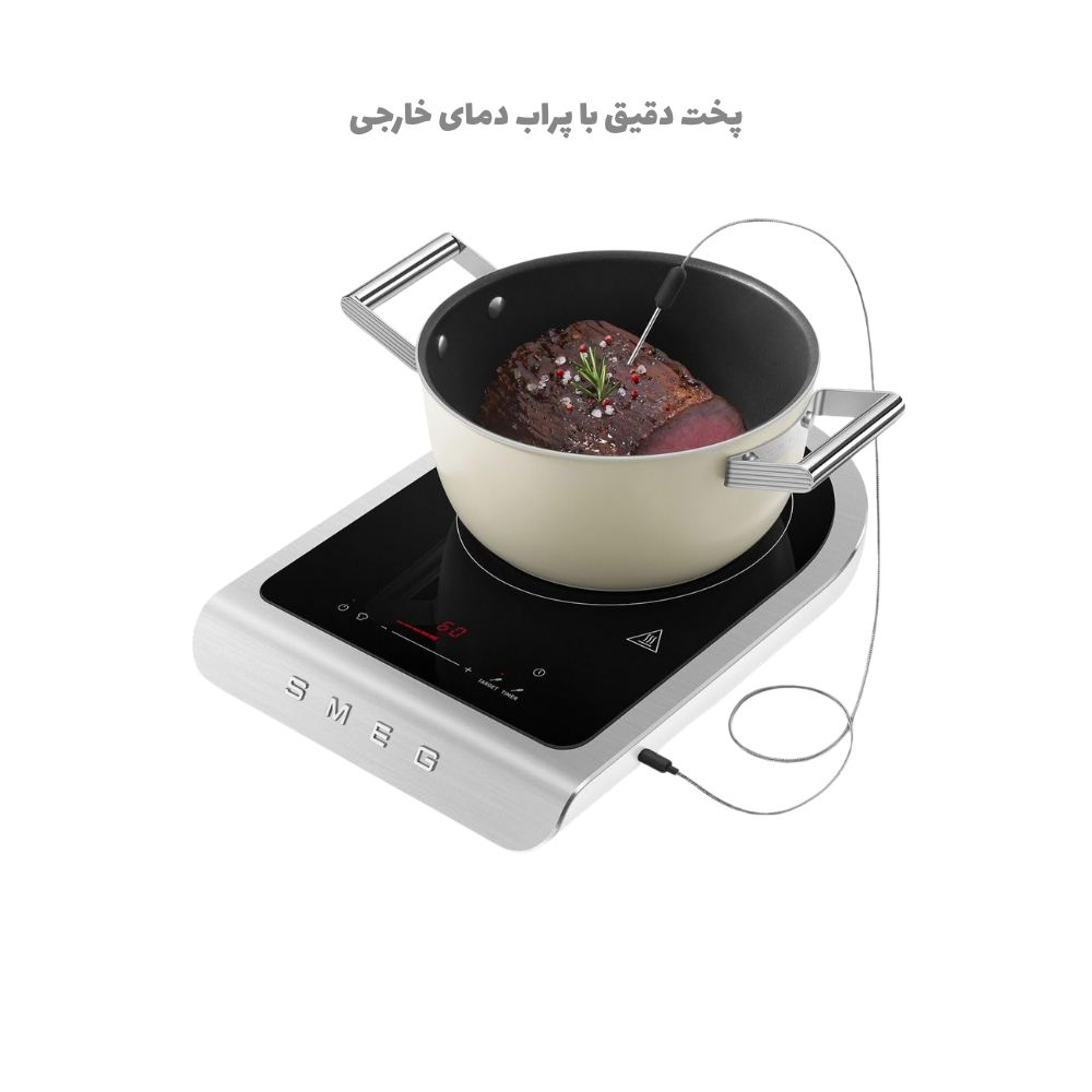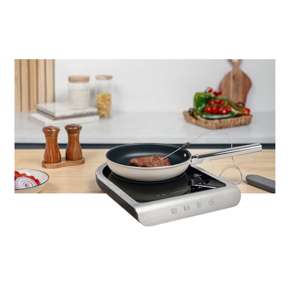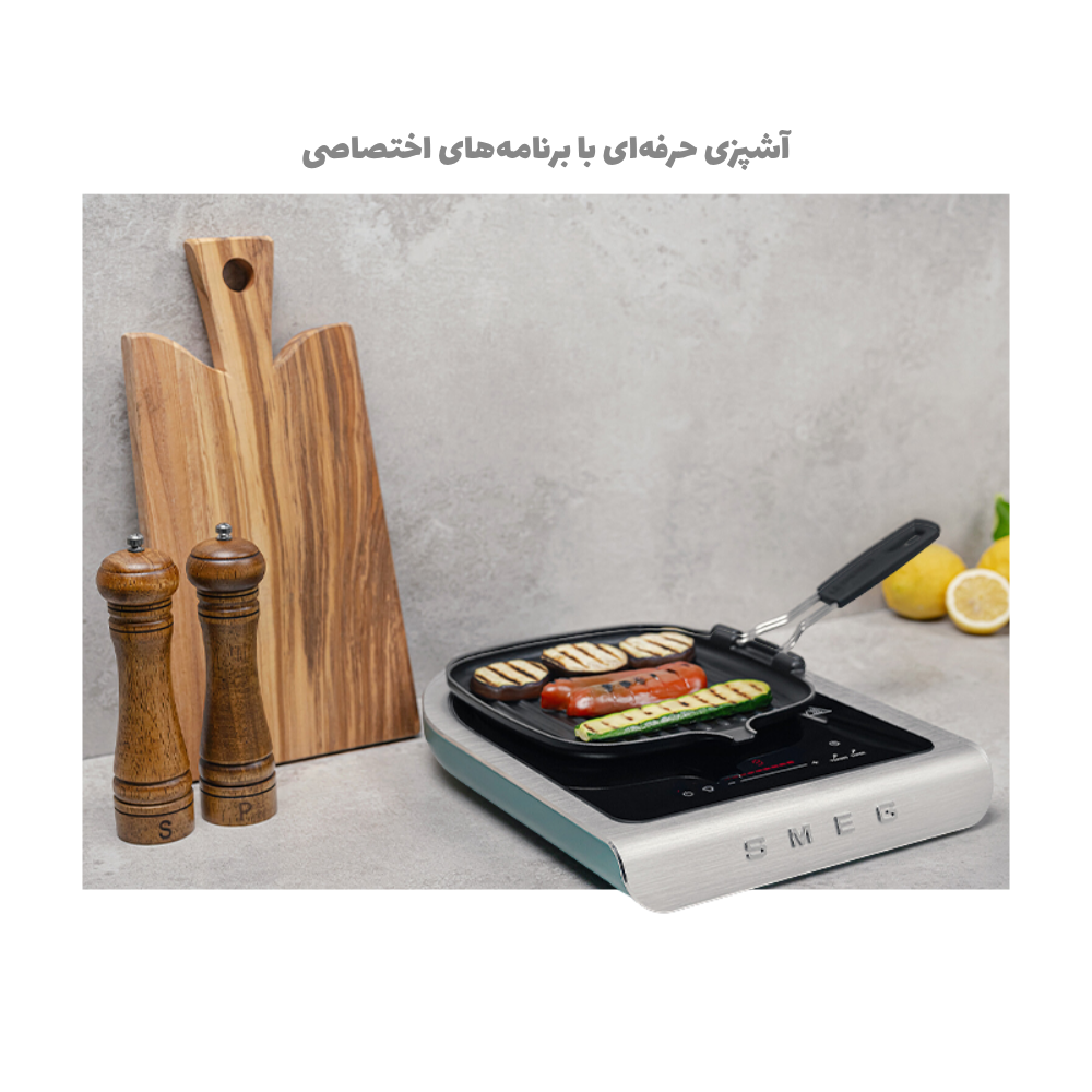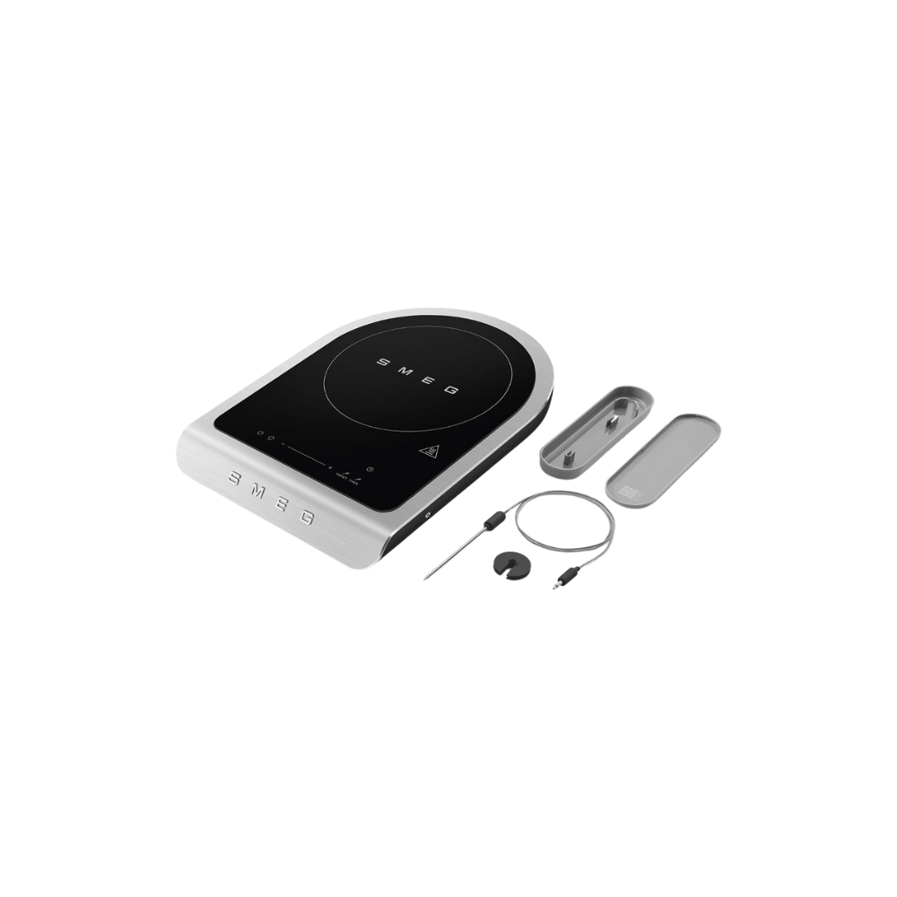 اجاق القایی Smeg PIC01: یک اجاق القایی قابل حمل برای آشپزی دقیق با پراب دمای خارجی (حالت‌های Probe Target و Probe Timer) ، دارای برنامه‌های خودکار Barbecue و Fry ، نُه سطح قدرت و عملکرد Boost ، کنترل لمسی و حالت گرم نگه داشتن است. این محصول با طراحی Collezione Aesthetic در رنگ‌های مشکی مات، سبز پسته ای و سفید مات، ابعادی تقریبی ۳۰ × ۳۷ × ۴.۷ سانتی‌متر و وزن حدود ۲.۷ کیلوگرم دارد.